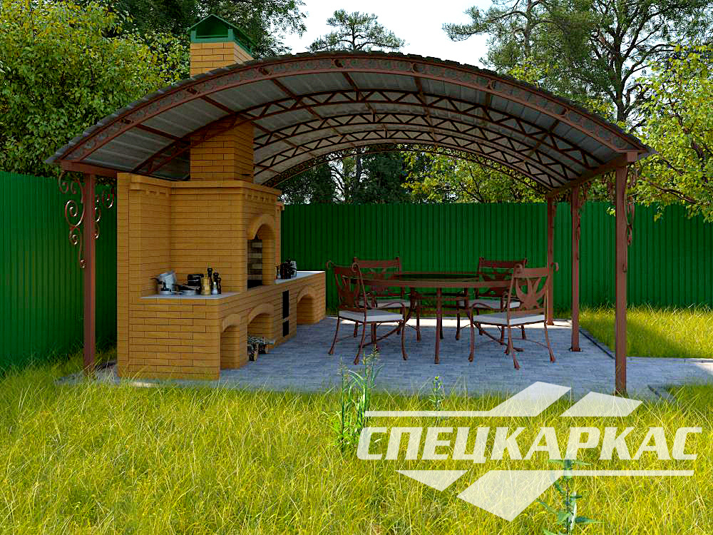 Компания «Спецкаркас» предлагает козырьки, беседки, навесы из поликарбоната любого типа и формата: одно- и двухскатные, прямые и наклонные, арочные и даже куполообразные.